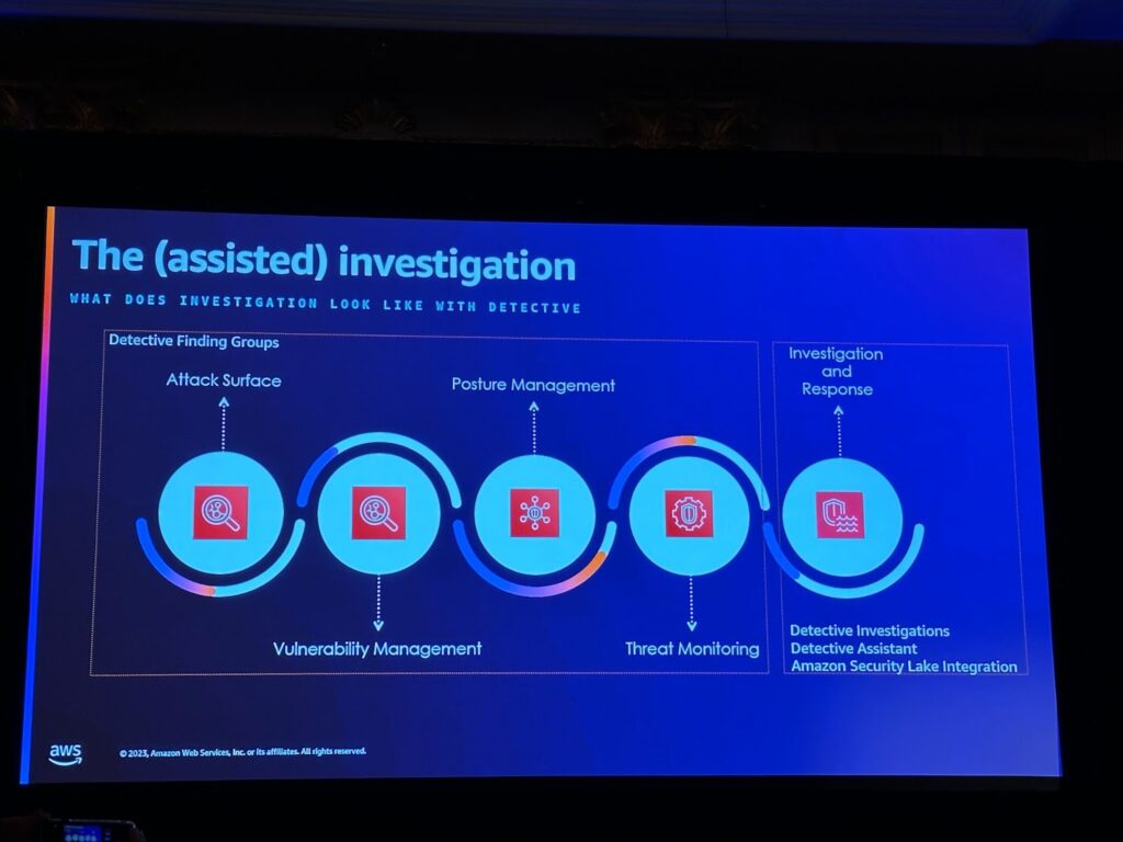 Amazon DetectiveはAWSの完全管理型セキュリティサービスで、Security Hub、GuardDurtyなど他のセキュリティサービスと連携して使うことができます。今回のリインベントで最も大きな話題であったAIとこのサービスの組み合わせにより、どのようなことがより良くなり、どのように使うことができるのかについて学びたいと思い、このセッションを申し込みました。