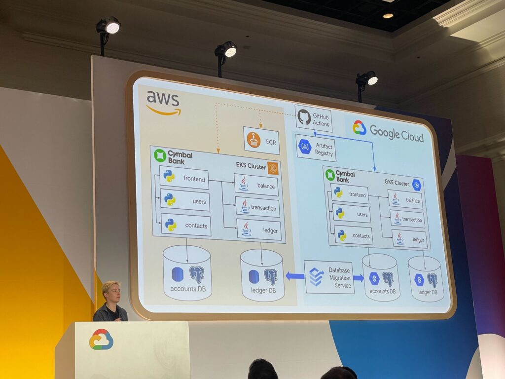 デモでは、金融系アプリ「Simple Bank」を以下のステップでAWS→GCPへ移行する方法を実演されておりました。